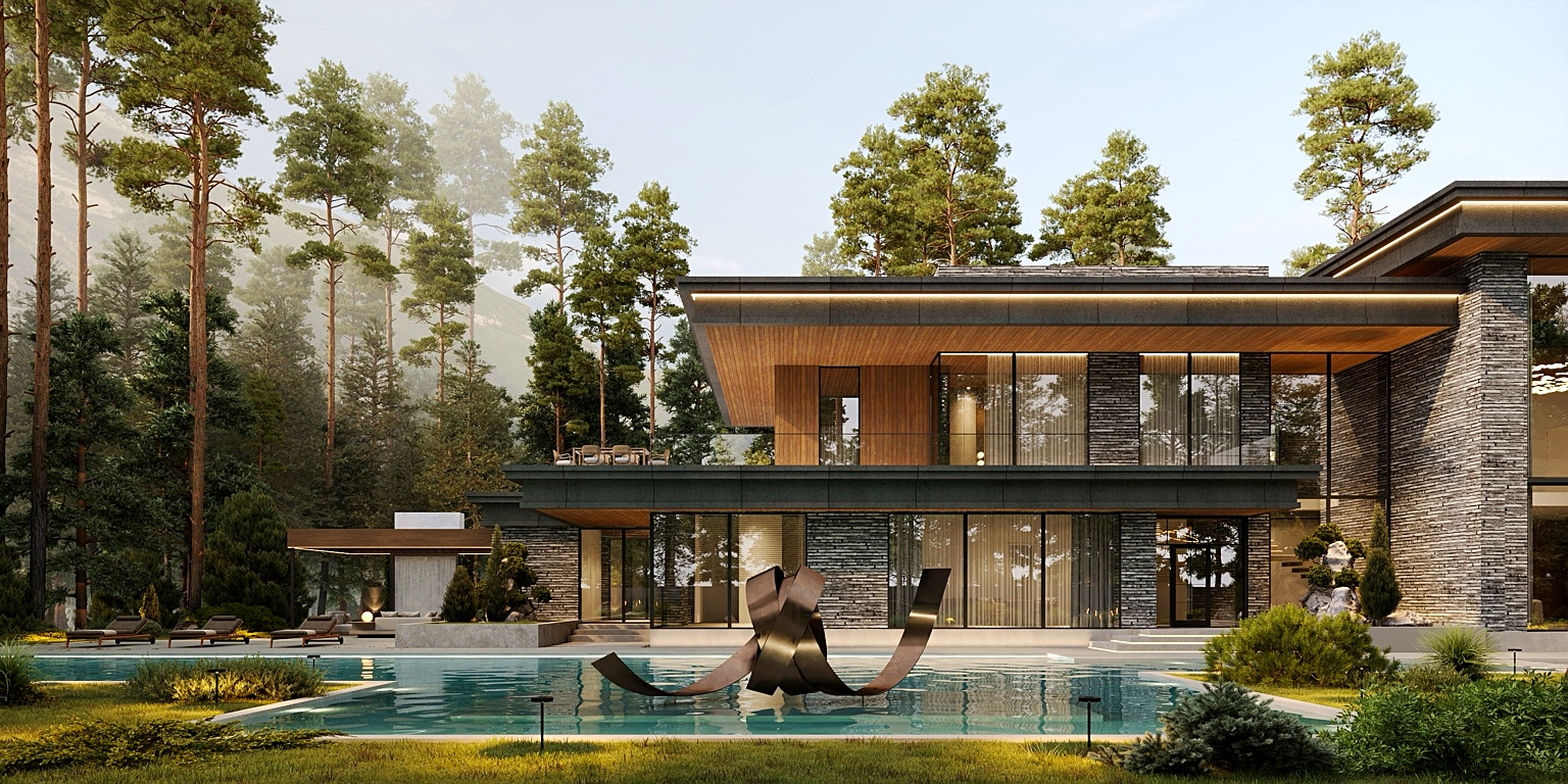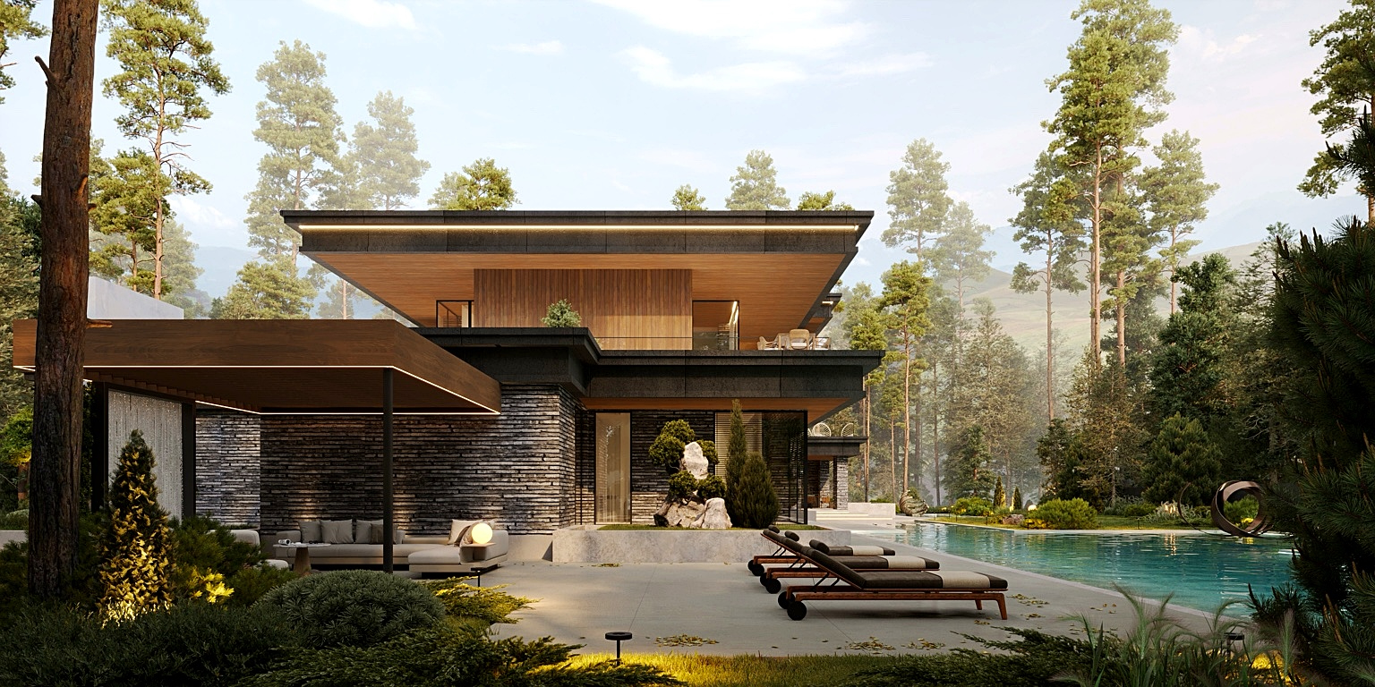 Интерьер и экстерьер словно перетекают друг в друга: панорамное остекление открывает виды на сосновый лес и горные вершины, наполняя пространство светом и воздухом. Каждое решение, от фактуры фасада до геометрии террасы, продумано для того, чтобы подчеркнуть естественную красоту окружающей природы.