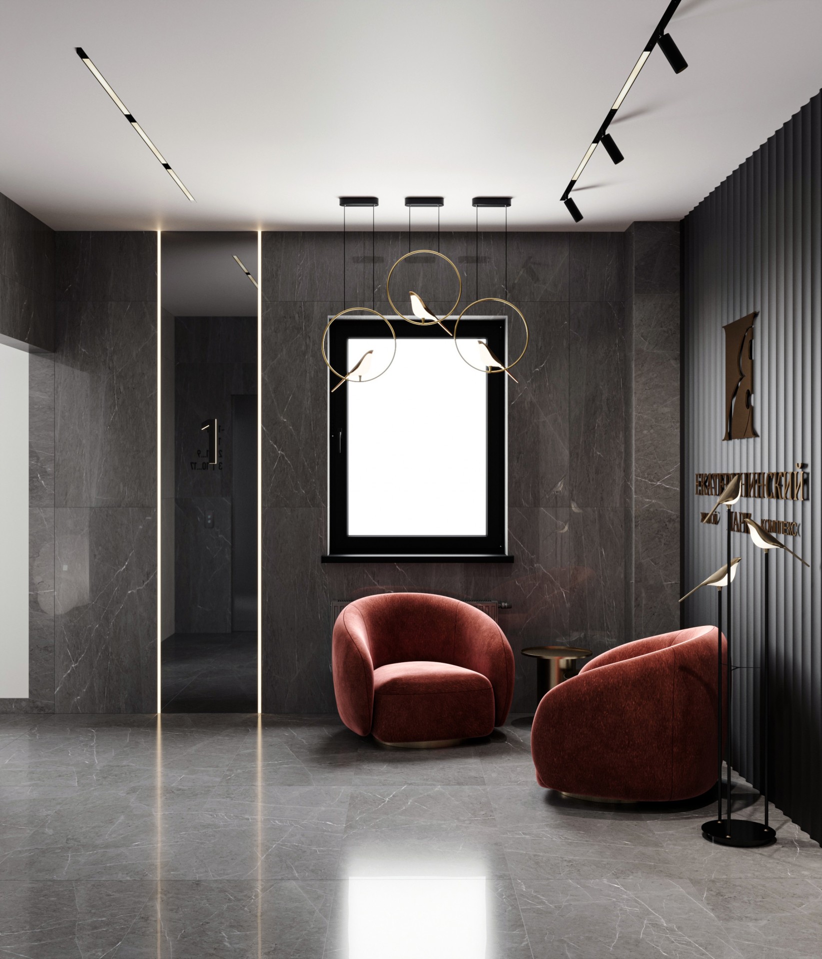 Особое внимание уделено зоне ресепшена, где установлены уникальные светильники в виде птиц. Они не только обеспечивают необходимое освещение, но и служат стильным декоративным элементом, добавляющим пространству легкости и элегантности. Этот элемент подчеркивает индивидуальность проекта и создает приятное первое впечатление.