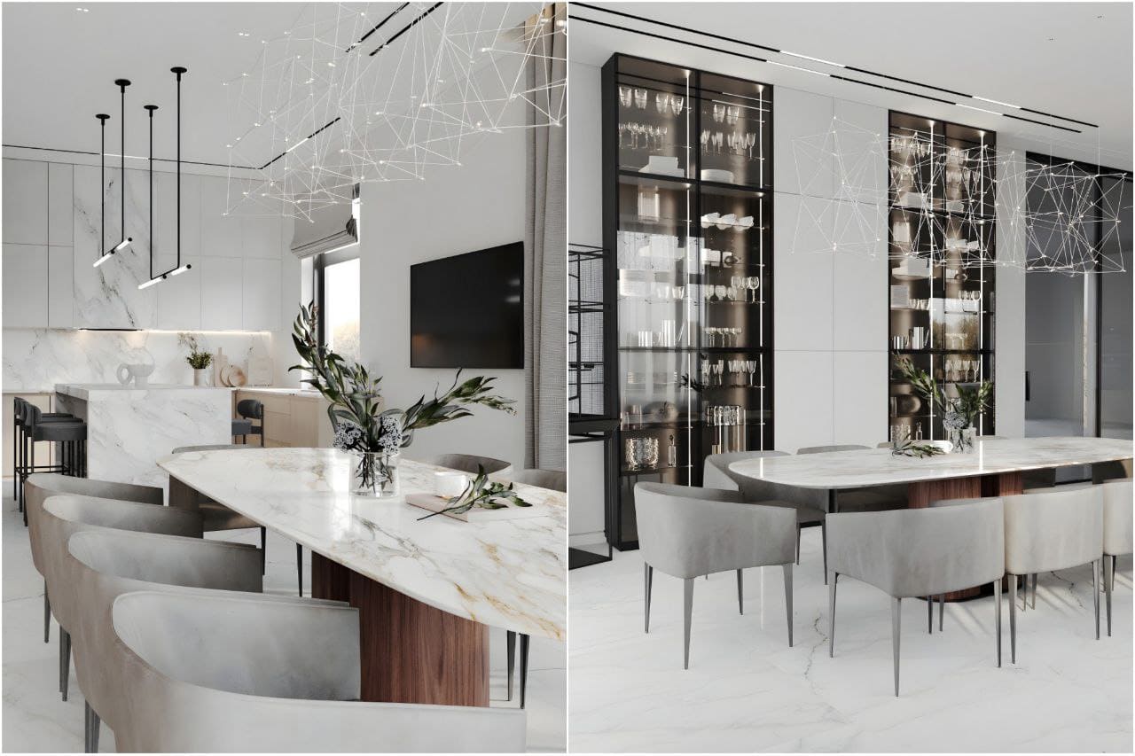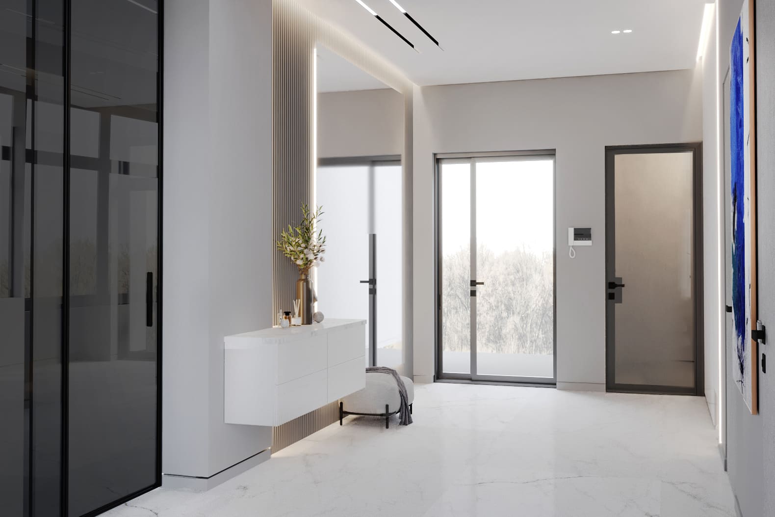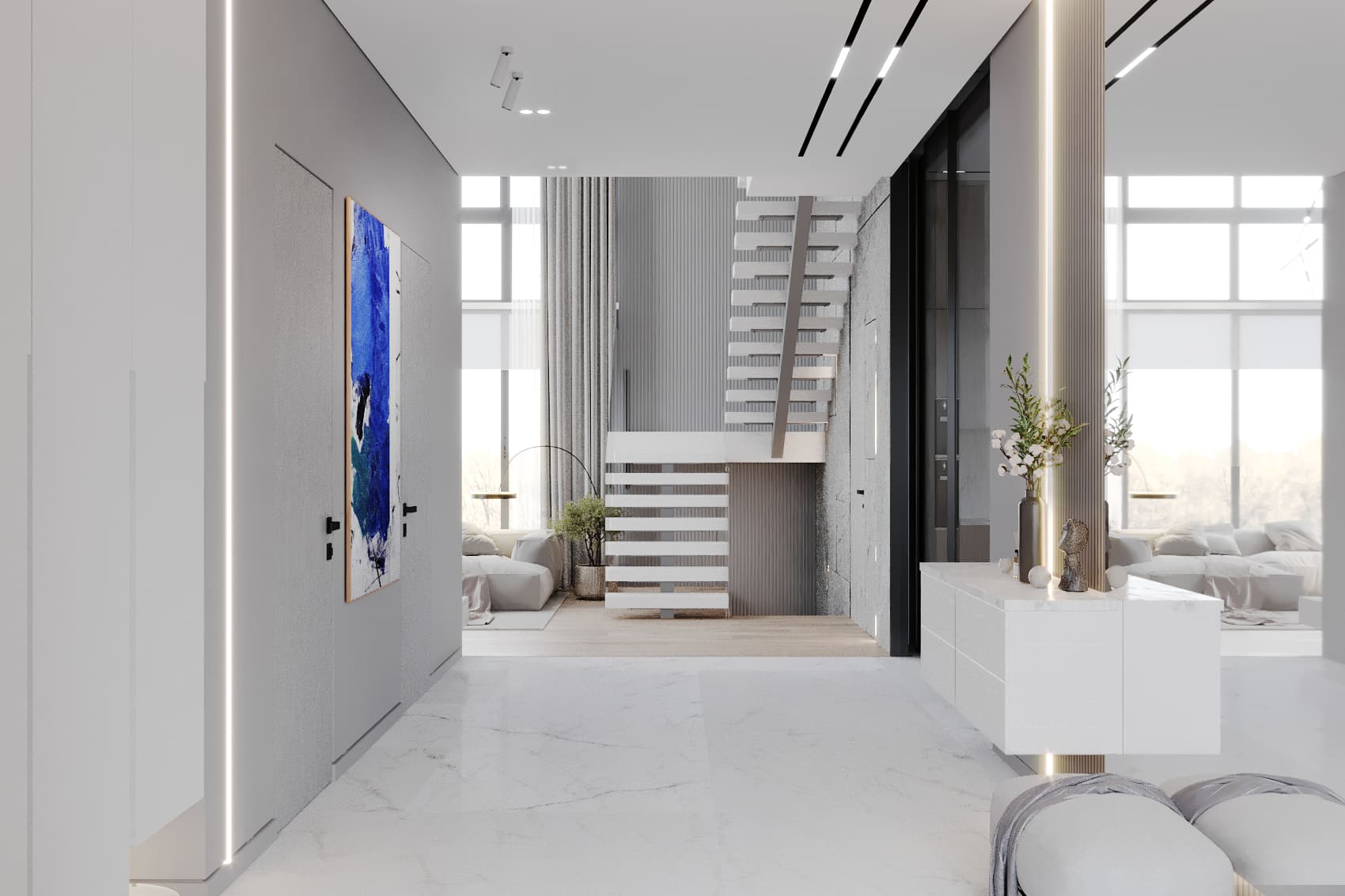 Двухэтажный дом для пары без детей. Стилевое направление – современное с элементами минимализма. Среди пожеланий заказчицы можно выделить следующие: максимально практичные материалы и отсутствие черного в интерьере.