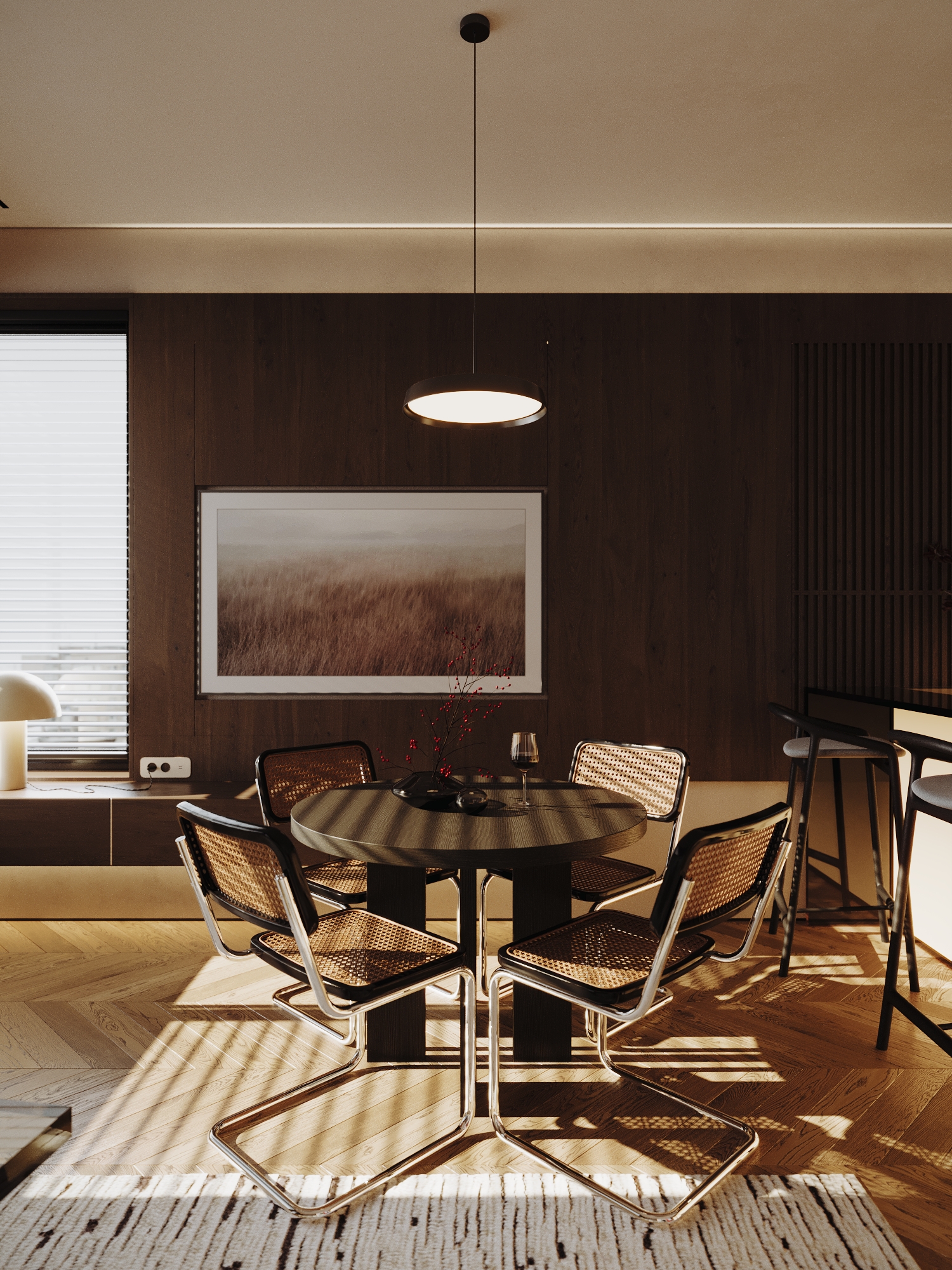 Центром композиции стал остров с мягкой подсветкой, наполняющей пространство теплом. Лаконичные барные стулья на металлических опорах поддерживают визуальную лёгкость и воздушность интерьера. Пол выложен паркетом «ёлочкой» из натурального дуба, который задаёт ритм и добавляет пространству графичности.